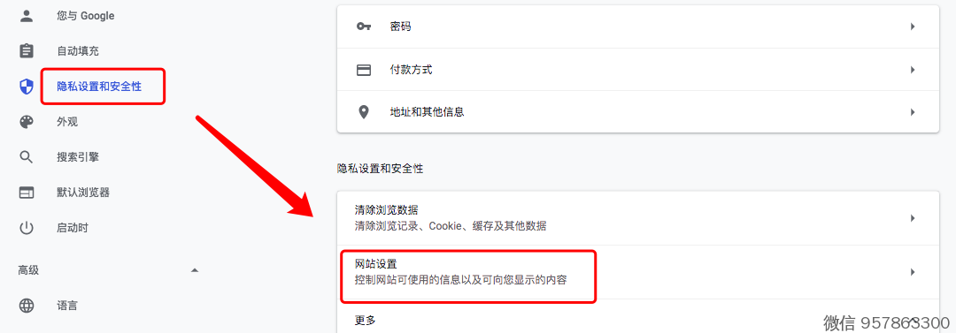 - 在“隐私设置和安全性”下方,点击网站设置。