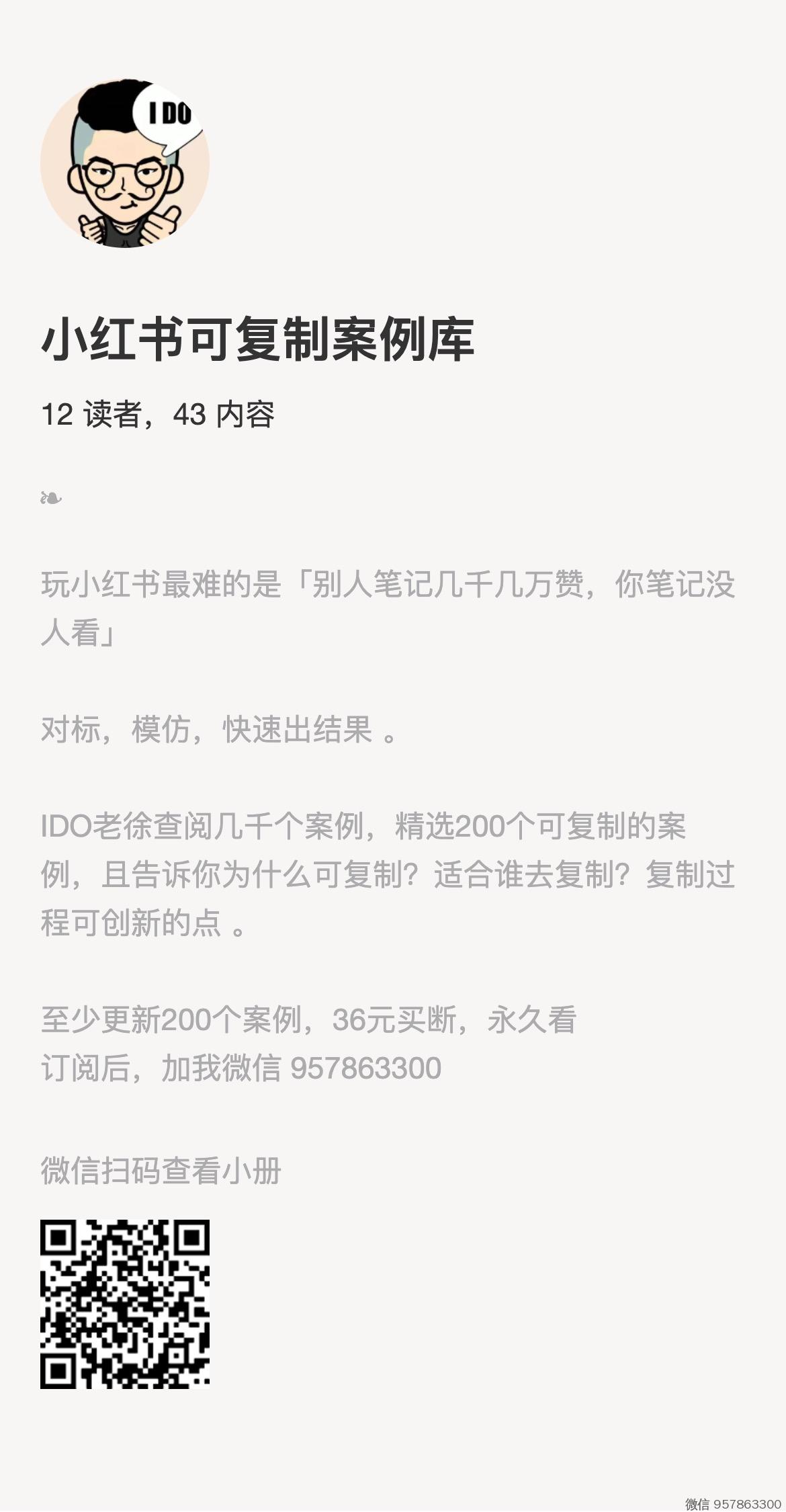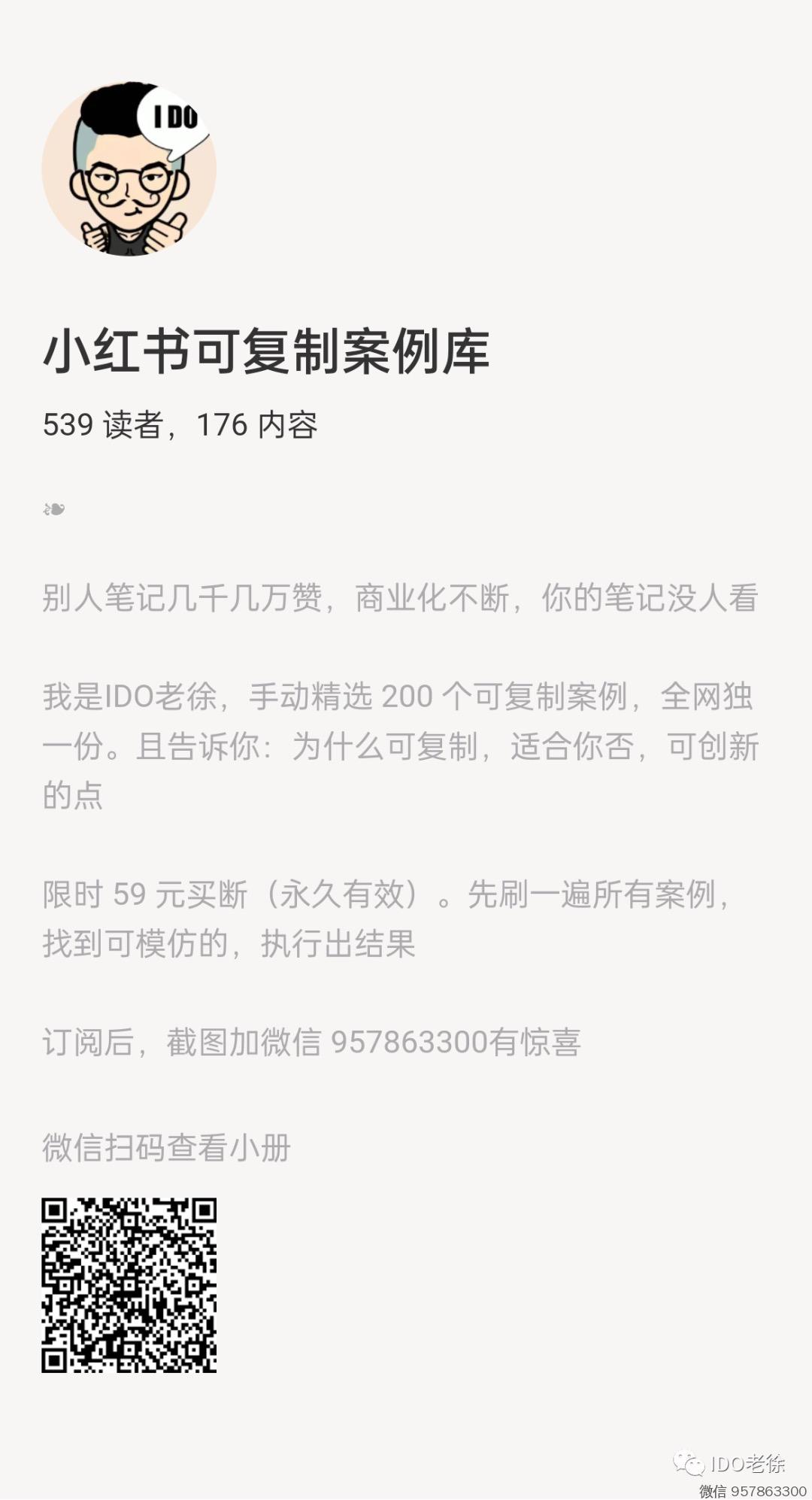 200 个案例 ,59 元(永久有效),由 IDO老徐 手工精选 200 个小红书可复制案例 。